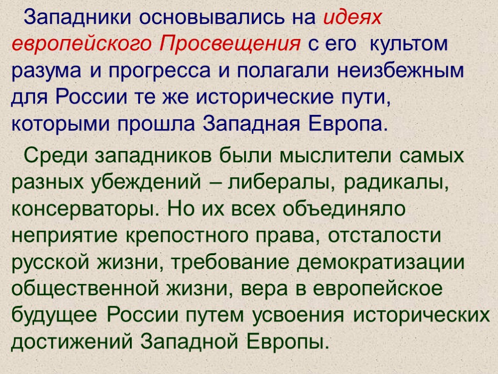 Западники основывались на идеях европейского Просвещения с его культом разума и прогресса и полагали неизбежным для России те же исторические пути, которыми прошла Западная Европа. Среди западников были мыслители самых разных убеждений – либералы, радикалы, консерваторы. Но их всех объединяло неприятие крепостного права, отсталости русской жизни, требование демократизации общественной жизни, вера в европейское будущее России путем усвоения исторических достижений Западной Европы.