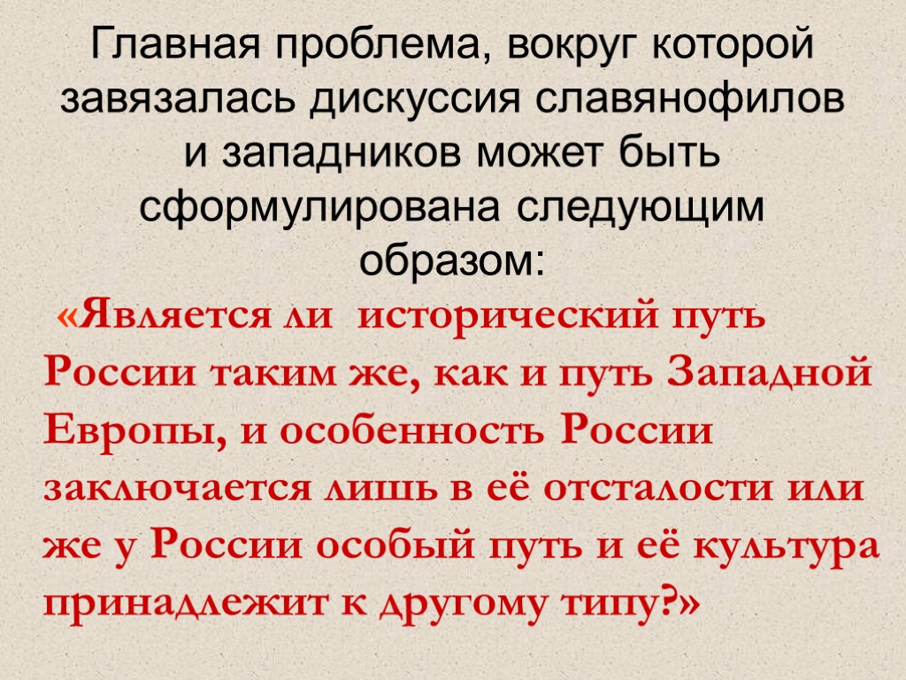 Главная проблема, вокруг которой завязалась дискуссия славянофилов и западников может быть сформулирована следующим образом: «Является ли исторический путь России таким же, как и путь Западной Европы, и особенность России заключается лишь в её отсталости или же у России особый путь и её культура принадлежит к другому типу?»