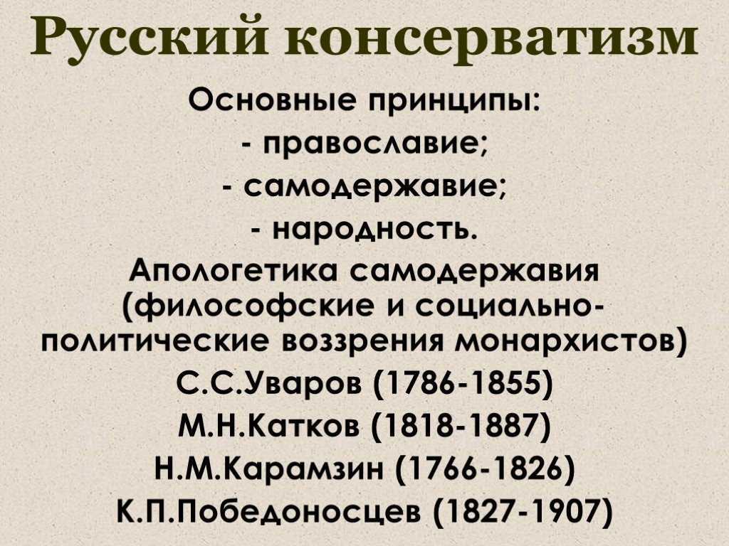 Русский консерватизм Основные принципы: - православие; - самодержавие; - народность. Апологетика самодержавия (философские и социально-политические воззрения монархистов) С.С.Уваров (1786-1855) М.Н.Катков (1818-1887) Н.М.Карамзин (1766-1826) К.П.Победоносцев (1827-1907)