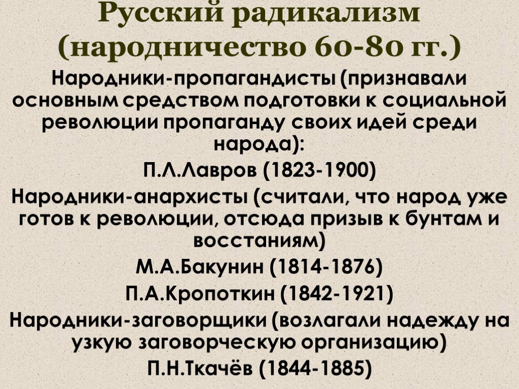 Русский радикализм (народничество 60-80 гг.) Народники-пропагандисты (признавали основным средством подготовки к социальной революции пропаганду своих идей среди народа): П.Л.Лавров (1823-1900) Народники-анархисты (считали, что народ уже готов к революции, отсюда призыв к бунтам и восстаниям) М.А.Бакунин (1814-1876) П.А.Кропоткин (1842-1921) Народники-заговорщики (возлагали надежду на узкую заговорческую организацию) П.Н.Ткачёв (1844-1885)