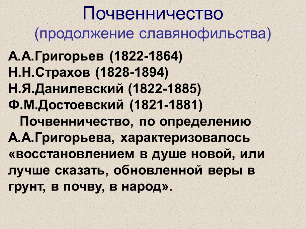 Почвенничество (продолжение славянофильства) А.А.Григорьев (1822-1864) Н.Н.Страхов (1828-1894) Н.Я.Данилевский (1822-1885) Ф.М.Достоевский (1821-1881) Почвенничество, по определению А.А.Григорьева, характеризовалось «восстановлением в душе новой, или лучше сказать, обновленной веры в грунт, в почву, в народ».