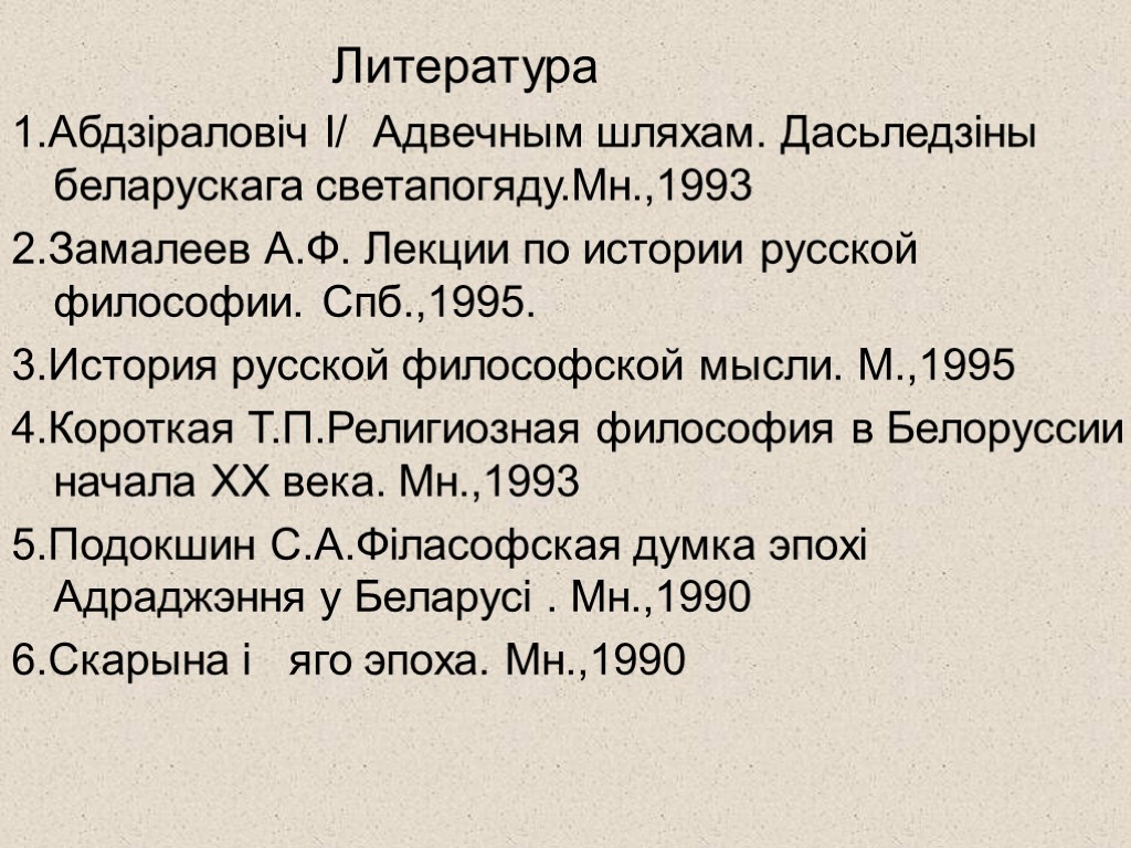 Литература 1.Абдзiраловiч I/ Адвечным шляхам. Дасьледзiны беларускага светапогяду.Мн.,1993 2.Замалеев А.Ф. Лекции по истории русской философии. Спб.,1995. 3.История русской философской мысли. М.,1995 4.Короткая Т.П.Религиозная философия в Белоруссии начала ХХ века. Мн.,1993 5.Подокшин С.А.Фiласофская думка эпохi Адраджэння у Беларусi . Мн.,1990 6.Скарына i яго эпоха. Мн.,1990