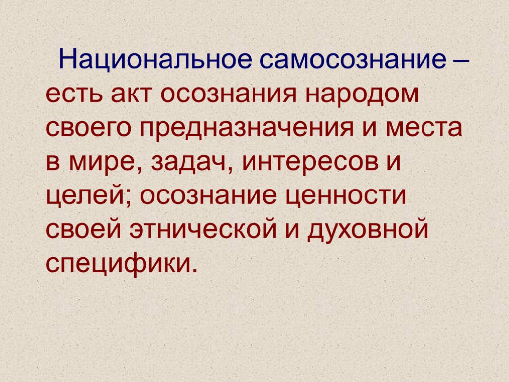 Национальное самосознание – есть акт осознания народом своего предназначения и места в мире, задач, интересов и целей; осознание ценности своей этнической и духовной специфики.