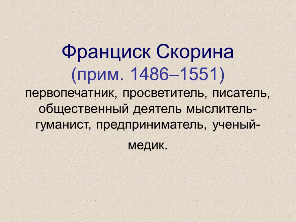 Франциск Скорина (прим. 1486–1551) первопечатник, просветитель, писатель, общественный деятель мыслитель-гуманист, предприниматель, ученый-медик.