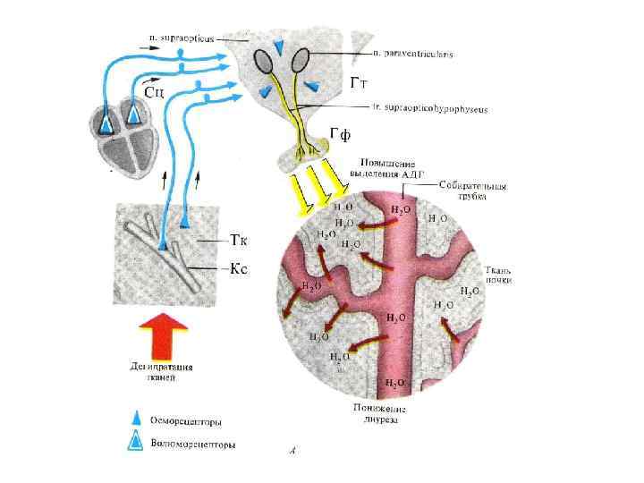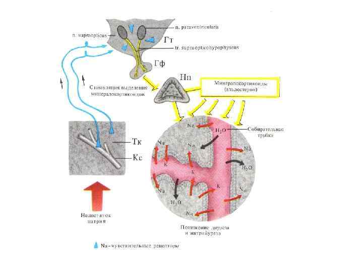 Гуморальная регуляция Гормоны: 1. АДГ (антидиуретический гормон) – усиливает реабсорбцию воды. 2. Альдостерон – усиливает реабсорбцию ионов Na+. 3. Натрийуретрический гормон – усиливает выделение ионов Na+. 4. Паратгормон – усиливает всасывание ионов Са++. 5. Тиреокальцийтонин – усиливает выделение ионов Са++. 6. Адреналин – в малых дозах уменьшает фильтрацию, в больших – усиливает фильтрацию. 7. Тироксин – увеличивает диурез. 8. Соматотропный гормон – усиливает диурез. 9. Инсулин уменьшает выделение ионов К+.