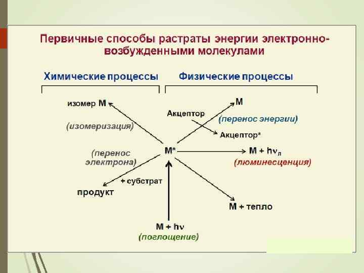 II. Стадии фотобиологических процессов: 1. Поглощение фотона света (hn) молекулой-акцептором 2. Внутримолекулярный перенос энергии 3. Меж-молекулярный перенос энергии ПРОЦЕССЫ 1 -3 – физические 4 -6 – химические 7 – физиологические 4. Первичный фотохимический акт (образование нестабильных фотопродуктов из возбужденных состояний S 1 или T 1 ) 5. Темновые реакции, приводящие к образованию стабильных фотопродуктов 6. Биохимические реакции с участием стабильных фотопродуктов 7. Физиологический ответ организма на действие света
