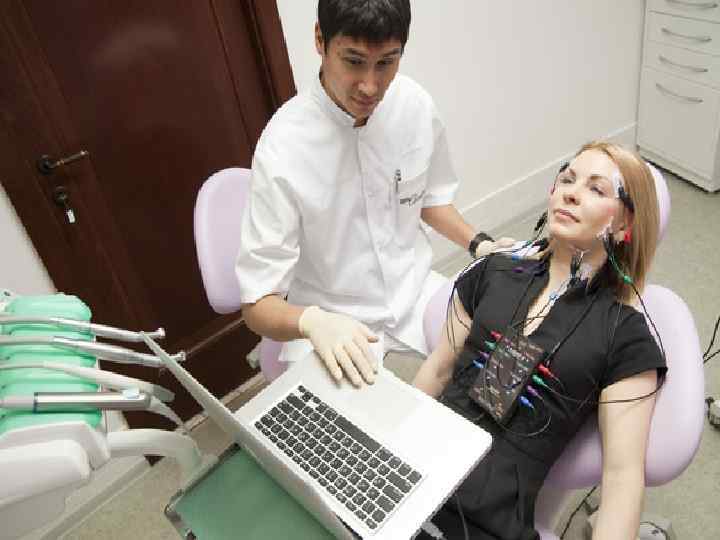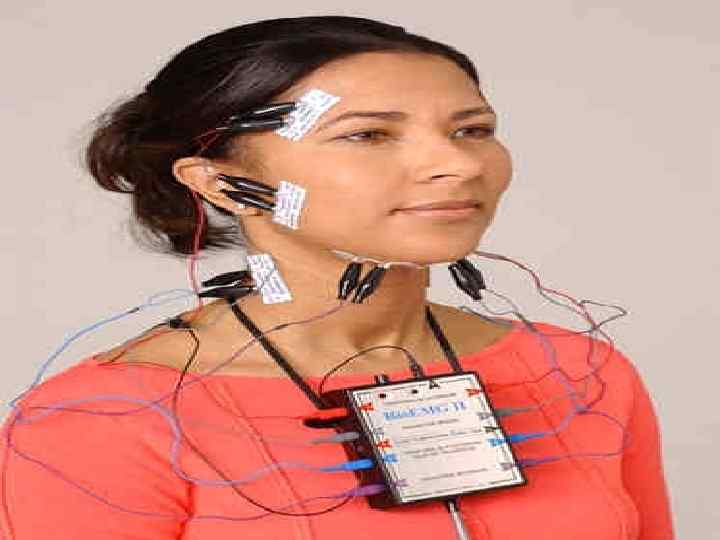 • В ортодонтической практике электромиографию используют для оценки функционального состояния челюстно-лицевой области в норме, а также при зубочелюстных аномалиях до, в процессе лече • ния и после его окончания. Обычно используют поверхностную электромиографию собственно жевательных, височных, мимических мышц, языка, а также мышц дна полости рта. Исследование указанных мышц проводят в состоянии покоя, при максимальном напряжении, а также при естественных движениях (жевательная нагрузка, глотание, выдвижение нижней челюсти вперед, произношение звуков речи и т. д. ). • Поверхностные биполярные электроды фиксируют с помощью лейкопластыря на область исследуемой мышцы после предварительного обезжиривания кожи Для исследования височных и собственно жевательных мышц используют электроды прямоугольной формы, для