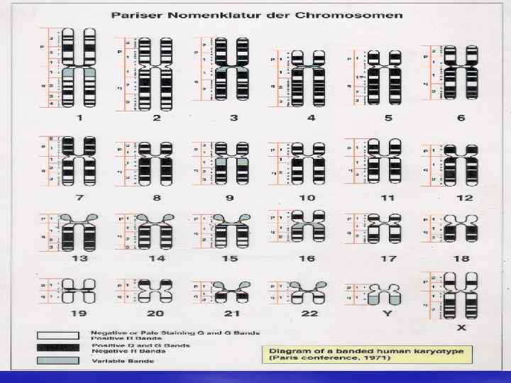 Систематические изображение G – сегментов хромосом человека и система их обозначения согласно решениям Парижской конференции в 1971 г. Цифрами обозначены номер хромосом; X и Y - половые хромосомы ; р – короткое, q – длинное плечи хромосом