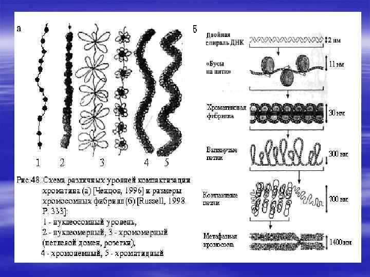 Уровни компактизации по Ченцову § § § 1. Нуклеосомный 2. Нуклеомерный 3. Хромомерный 4. Хромонемный 5. Хроматидный