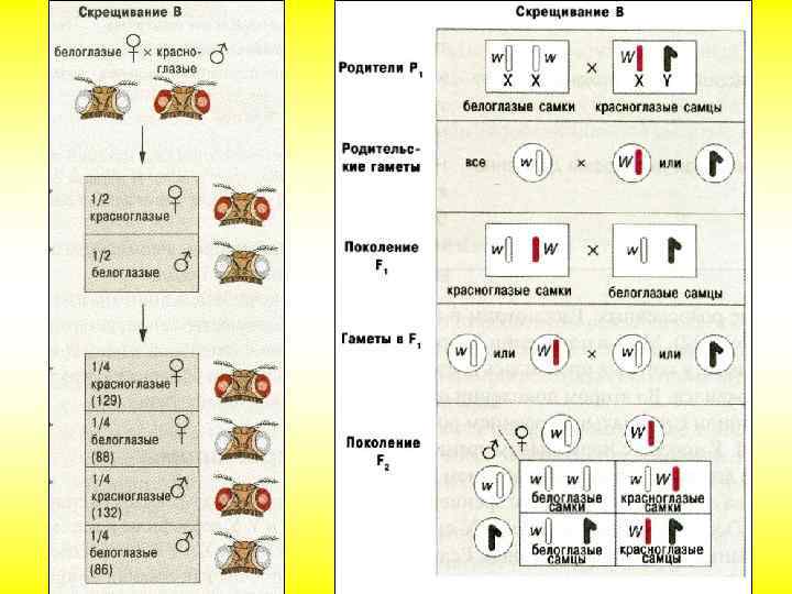 При скрещивания между собой белоглазых самок и красноглазых самцов, в первом поколении все самки оказываются красноглазыми, а самцы белоглазыми. В F 2 половина самок и самцов — красноглазые, половина — белоглазые.
