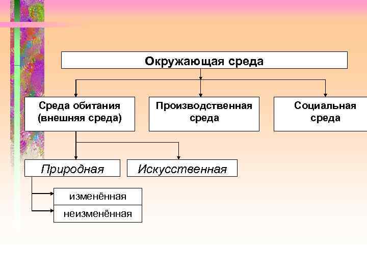 Окружающая среда Среда обитания Производственная Социальная (внешняя среда) среда Природная Искусственная изменённая неизменённая
