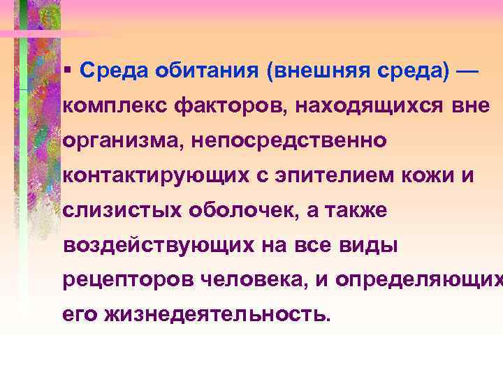§ Среда обитания (внешняя среда) — комплекс факторов, находящихся вне организма, непосредственно контактирующих с эпителием кожи и слизистых оболочек, а также воздействующих на все виды рецепторов человека, и определяющих его жизнедеятельность.