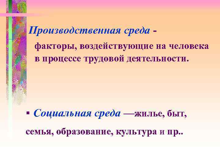 Производственная среда - факторы, воздействующие на человека в процессе трудовой деятельности. § Социальная среда —жилье, быт, семья, образование, культура и пр. .