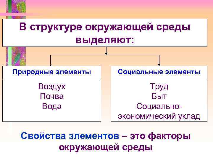 В структуре окружающей среды выделяют: Природные элементы Социальные элементы Воздух Труд Почва Быт Вода Социально- экономический уклад Свойства элементов – это факторы окружающей среды