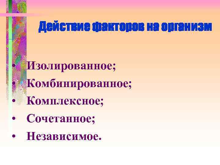 Действие факторов на организм • Изолированное; • Комбинированное; • Комплексное; • Сочетанное; • Независимое.