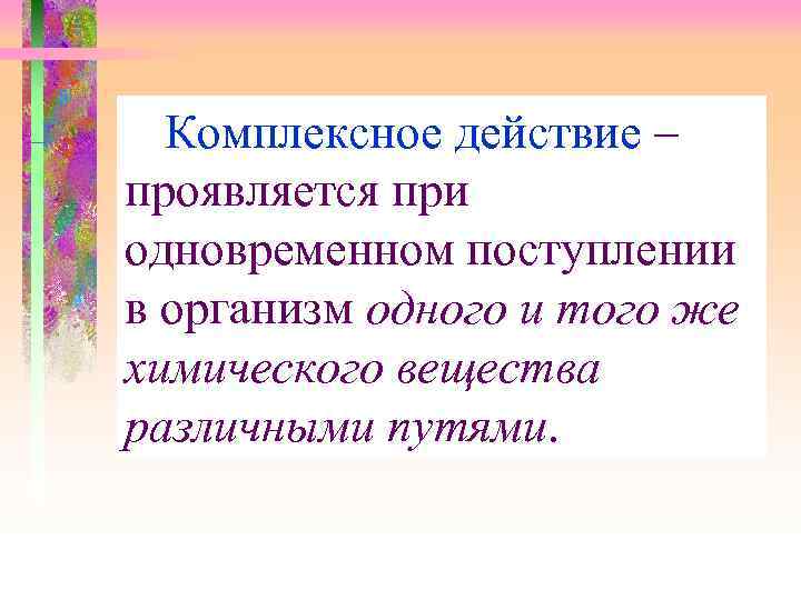 Комплексное действие – проявляется при одновременном поступлении в организм одного и того же химического вещества различными путями.