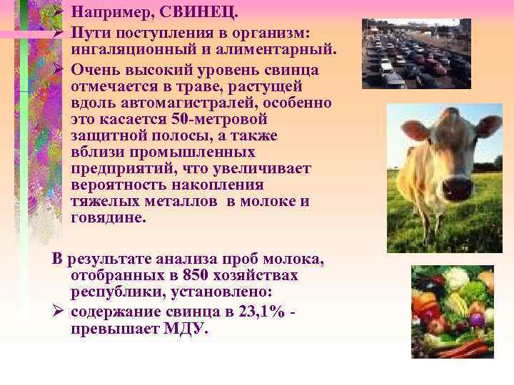 Ø Например, СВИНЕЦ. Ø Пути поступления в организм: ингаляционный и алиментарный. Ø Очень высокий уровень свинца отмечается в траве, растущей вдоль автомагистралей, особенно это касается 50 -метровой защитной полосы, а также вблизи промышленных предприятий, что увеличивает вероятность накопления тяжелых металлов в молоке и говядине. В результате анализа проб молока, отобранных в 850 хозяйствах республики, установлено: Ø содержание свинца в 23, 1% - превышает МДУ.