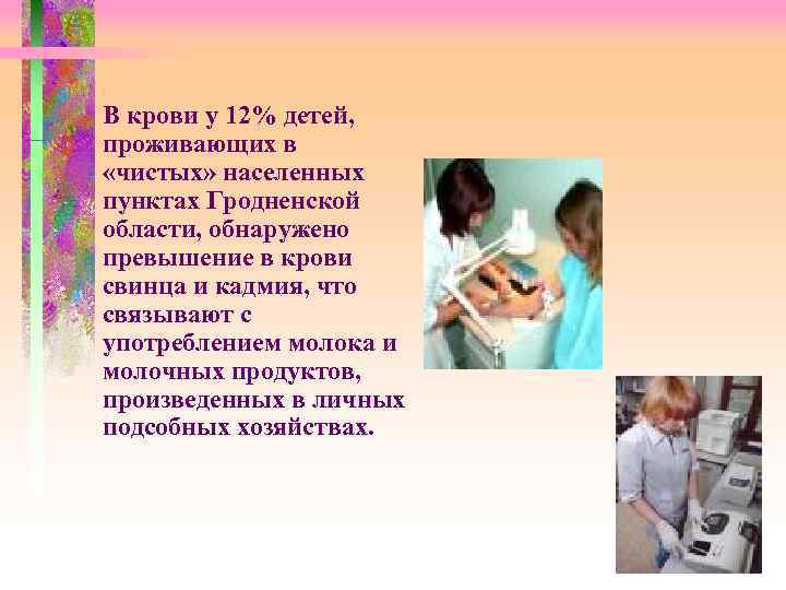 В крови у 12% детей, проживающих в «чистых» населенных пунктах Гродненской области, обнаружено превышение в крови свинца и кадмия, что связывают с употреблением молока и молочных продуктов, произведенных в личных подсобных хозяйствах.