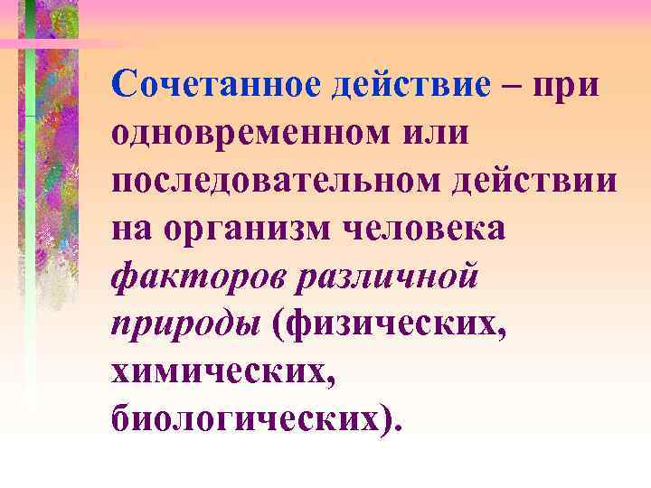 Сочетанное действие – при одновременном или последовательном действии на организм человека факторов различной природы (физических, химических, биологических).