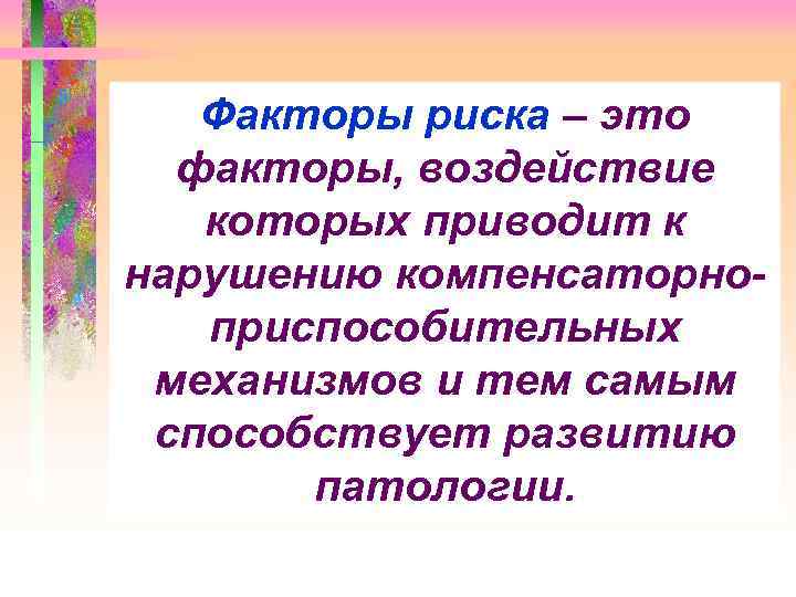 Факторы риска – это факторы, воздействие которых приводит к нарушению компенсаторно- приспособительных механизмов и тем самым способствует развитию патологии.