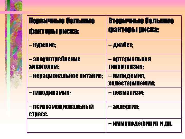 Первичные большие Вторичные большие факторы риска: – курение; – диабет; – злоупотребление – артериальная алкоголем; гипертензия; – нерациональное питание; – липидемия, холестеринемия; – гиподинамия; – ревматизм; – психоэмоциональный – аллергия; стресс. – иммунодефицит и др.
