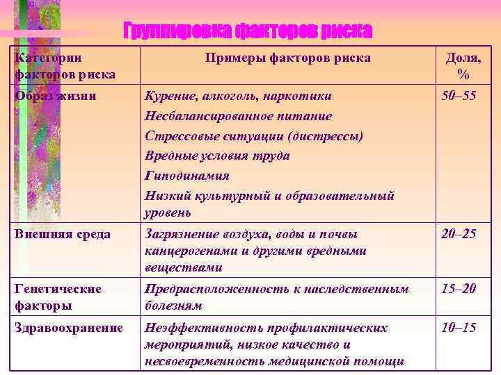 Группировка факторов риска Категории Примеры факторов риска Доля, факторов риска % Образ жизни Курение, алкоголь, наркотики 50– 55 Несбалансированное питание Стрессовые ситуации (дистрессы) Вредные условия труда Гиподинамия Низкий культурный и образовательный уровень Внешняя среда Загрязнение воздуха, воды и почвы 20– 25 канцерогенами и другими вредными веществами Генетические Предрасположенность к наследственным 15– 20 факторы болезням Здравоохранение Неэффективность профилактических 10– 15 мероприятий, низкое качество и несвоевременность медицинской помощи