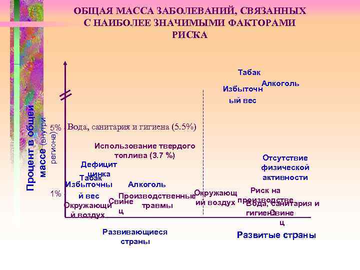 ОБЩАЯ МАССА ЗАБОЛЕВАНИЙ, СВЯЗАННЫХ С НАИБОЛЕЕ ЗНАЧИМЫМИ ФАКТОРАМИ РИСКА Табак Алкоголь Избыточн ый вес Процент в общей массе (внутри 5% - Вода, санитария и гигиена (5. 5%) региона) Использование твердого топлива (3. 7 %) Отсутствие Дефицит физической цинка активности Табак Избыточны Алкоголь 1% - Окружающ Риск на й вес Производственные Окружающи Свине травмы ий воздух производстве Вода, санитария и ц гигиена Свине й воздух ц Развивающиеся Развитые страны страны