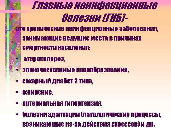 Главные неинфекционные болезни (ГНБ)- это хронические неинфекционные заболевания, занимающие ведущие места в причинах смертности населения: • атеросклероз, • злокачественные новообразования, • сахарный диабет 2 типа, • ожирение, • артериальная гипертензия, • болезни адаптации (патологические процессы, возникающие из-за действия стрессов) и др.