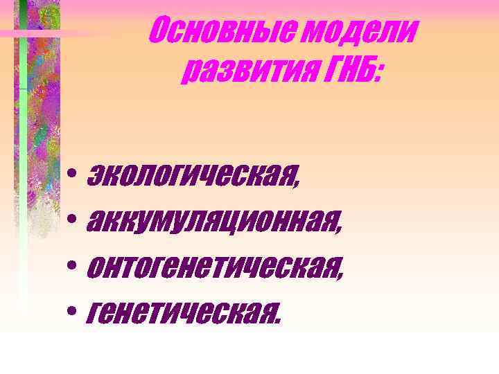 Основные модели развития ГНБ: • экологическая, • аккумуляционная, • онтогенетическая, • генетическая.