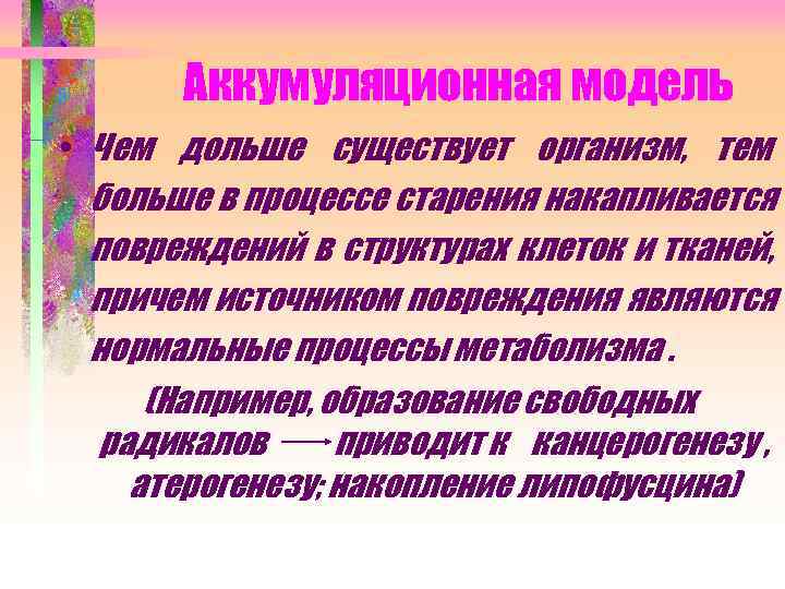 Аккумуляционная модель • Чем дольше существует организм, тем больше в процессе старения накапливается повреждений в структурах клеток и тканей, причем источником повреждения являются нормальные процессы метаболизма. (Например, образование свободных радикалов приводит к канцерогенезу , атерогенезу; накопление липофусцина)