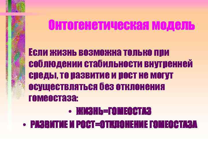 Онтогенетическая модель Если жизнь возможна только при соблюдении стабильности внутренней среды, то развитие и рост не могут осуществляться без отклонения гомеостаза: • ЖИЗНЬ=ГОМЕОСТАЗ • РАЗВИТИЕ И РОСТ=ОТКЛОНЕНИЕ ГОМЕОСТАЗА