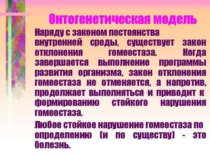 Онтогенетическая модель Наряду с законом постоянства внутренней среды, существует закон отклонения гомеостаза. Когда завершается выполнение программы развития организма, закон отклонения гомеостаза не отменяется, а напротив, продолжает выполняться и приводит к формированию стойкого нарушения гомеостаза. Любое стойкое нарушение гомеостаза по определению (и по существу) - это болезнь.