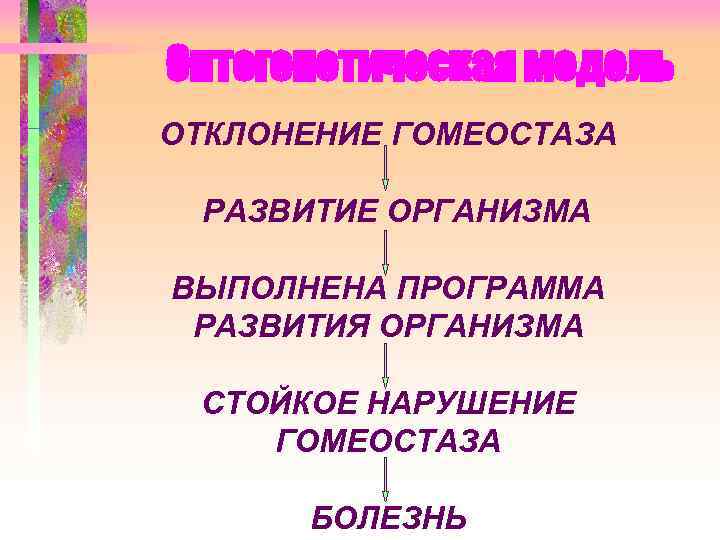 Онтогенетическая модель ОТКЛОНЕНИЕ ГОМЕОСТАЗА РАЗВИТИЕ ОРГАНИЗМА ВЫПОЛНЕНА ПРОГРАММА РАЗВИТИЯ ОРГАНИЗМА СТОЙКОЕ НАРУШЕНИЕ ГОМЕОСТАЗА БОЛЕЗНЬ