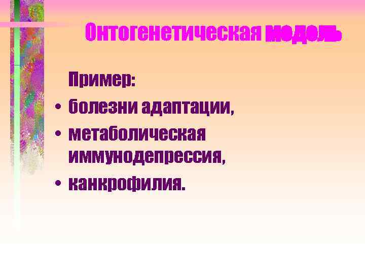 Онтогенетическая модель Пример: • болезни адаптации, • метаболическая иммунодепрессия, • канкрофилия.