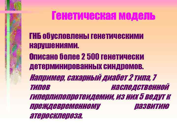 Генетическая модель ГНБ обусловлены генетическими нарушениями. Описано более 2 500 генетически детерминированных синдромов. Например, сахарный диабет 2 типа, 7 типов наследственной гиперлипопротеидемии, из них 5 ведут к преждевременному развитию атеросклероза.