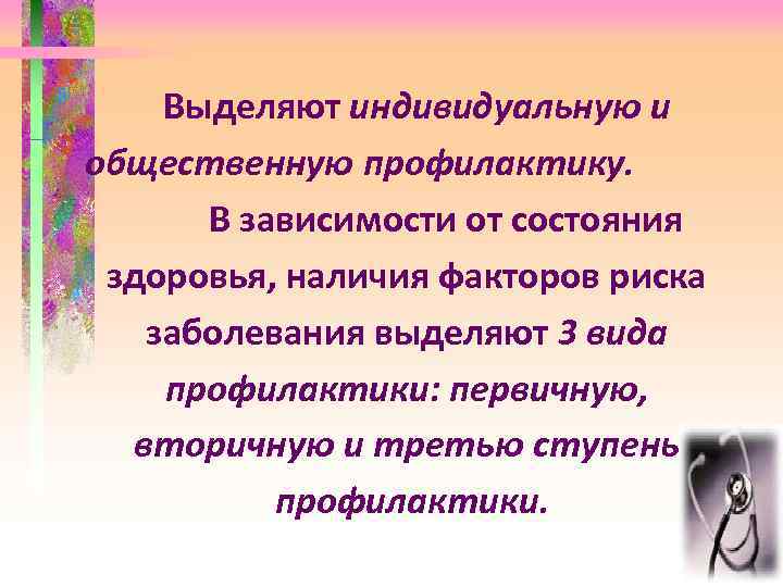 Выделяют индивидуальную и общественную профилактику. В зависимости от состояния здоровья, наличия факторов риска заболевания выделяют 3 вида профилактики: первичную, вторичную и третью ступень профилактики.