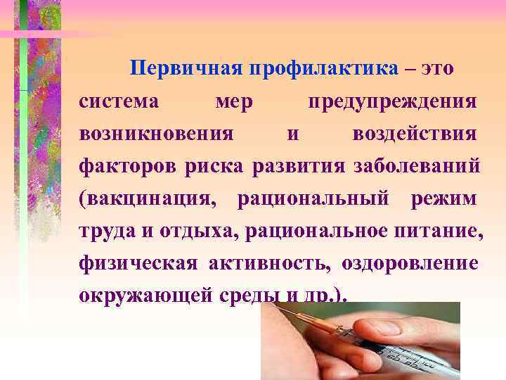 Первичная профилактика – это система мер предупреждения возникновения и воздействия факторов риска развития заболеваний (вакцинация, рациональный режим труда и отдыха, рациональное питание, физическая активность, оздоровление окружающей среды и др. ).