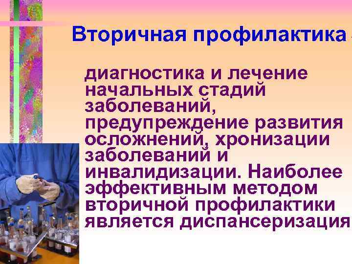 Вторичная профилактика – диагностика и лечение начальных стадий заболеваний, предупреждение развития осложнений, хронизации заболеваний и инвалидизации. Наиболее эффективным методом вторичной профилактики является диспансеризация.