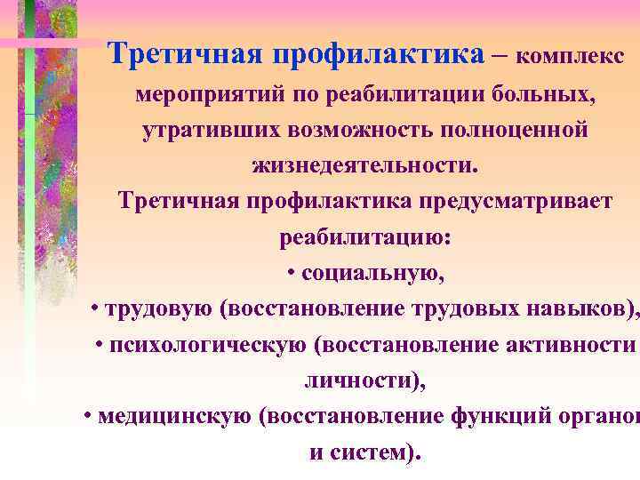 Третичная профилактика – комплекс мероприятий по реабилитации больных, утративших возможность полноценной жизнедеятельности. Третичная профилактика предусматривает реабилитацию: • социальную, • трудовую (восстановление трудовых навыков), • психологическую (восстановление активности личности), • медицинскую (восстановление функций органов и систем).