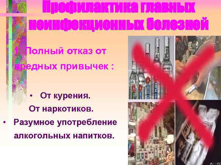 Профилактика главных неинфекционных болезней 1. Полный отказ от вредных привычек : • От курения. От наркотиков. • Разумное употребление алкогольных напитков.