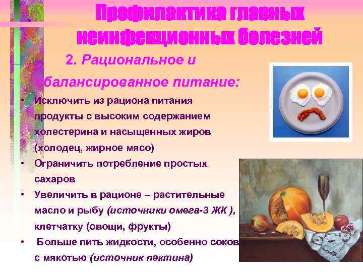 Профилактика главных неинфекционных болезней 2. Рациональное и сбалансированное питание: • Исключить из рациона питания продукты с высоким содержанием холестерина и насыщенных жиров (холодец, жирное мясо) • Ограничить потребление простых сахаров • Увеличить в рационе – растительные масло и рыбу (источники омега-3 ЖК ), клетчатку (овощи, фрукты) • Больше пить жидкости, особенно соков с мякотью (источник пектина)