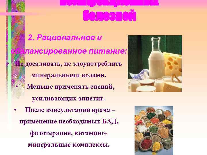 неинфекционных болезней 2. Рациональное и сбалансированное питание: • Не досаливать, не злоупотреблять минеральными водами. • Меньше применять специй, усиливающих аппетит. • После консультации врача – применение необходимых БАД, фитотерапия, витамино- минеральные комплексы.