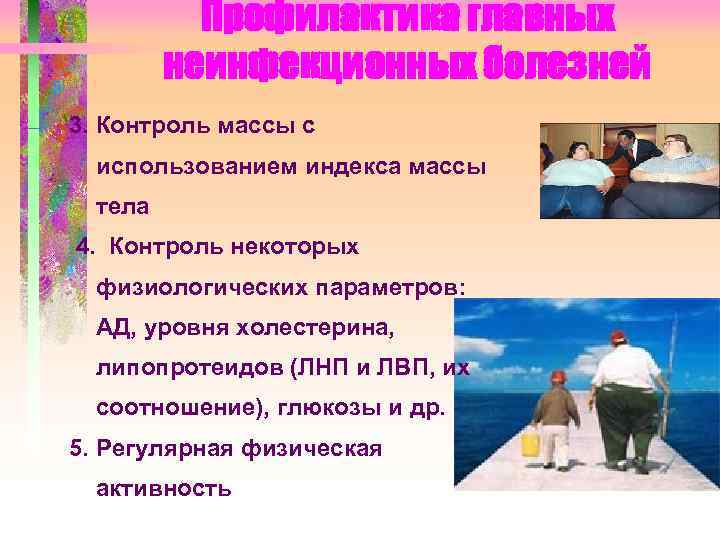 Профилактика главных неинфекционных болезней 3. Контроль массы с использованием индекса массы тела 4. Контроль некоторых физиологических параметров: АД, уровня холестерина, липопротеидов (ЛНП и ЛВП, их соотношение), глюкозы и др. 5. Регулярная физическая активность