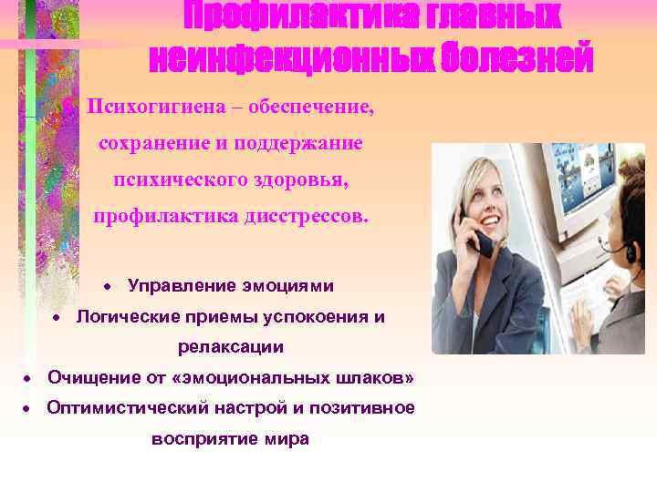 Профилактика главных неинфекционных болезней 6. Психогигиена – обеспечение, сохранение и поддержание психического здоровья, профилактика дисстрессов. Управление эмоциями Логические приемы успокоения и релаксации Очищение от «эмоциональных шлаков» Оптимистический настрой и позитивное восприятие мира