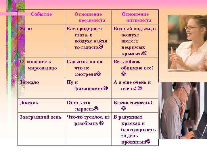 Событие Отношение пессимиста оптимиста Утро Еле продираем Бодрый подъем, в глаза, в воздухе воздухе какая шелест то гадость незримых крыльев Отношение к Глаза бы ни на Все люблю, мирозданию что не обнимаю все! смотрели Зеркало Ну и А я еще очень и физиономия очень! Дождик Опять эта Какая свежесть! сырость Завтрашний день Что-то тусклое, не В радужных разобрать красках и благодарность за день прожитый