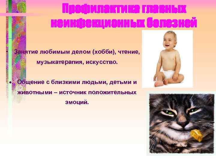 Профилактика главных неинфекционных болезней • Занятие любимым делом (хобби), чтение, музыкатерапия, искусство. Общение с близкими людьми, детьми и животными – источник положительных эмоций.