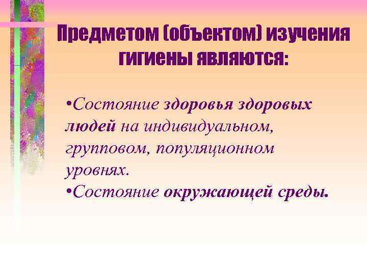 Предметом (объектом) изучения : гигиены являются: • Состояние здоровья здоровых людей на индивидуальном, групповом, популяционном уровнях. • Состояние окружающей среды.