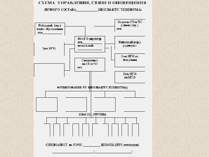 П Р И К А З ДИРЕКТОРА - НАЧАЛЬНИКА ГРАЖДАНСКОЙ ОБОРОНЫ ШКОЛЫ N__________ РАЙОНА N_____ "______" _______ 20__ г. г. __________ ОБ ОРГАНИЗАЦИИ И ВЕДЕНИИ ГРАЖДАНСКОЙ ОБОРОНЫ В ШКОЛЕ. _____________________________ Во исполнение требований Министерства образования РФ N 20/33 от 21. 05. 93 г. , постановления администрации области N 25 от 7. 06. 93 г. "Об организации и ведении гражданской обороны в Брянской области" и приказа Начальника гражданской обороны управления образования Брянской области. П Р И К А З Ы В А Ю: 1. Назначить: - Заместителем начальника гражданской обороны школы по эвакуации ………………. . ; - Заместителем начальника гражданской обороны школы по материально-техническому обеспечению _. . . . _; - Специалистом гражданской обороны _. . . . . _______; - Заместителем специалиста по ГО и ЧС школы - преподавателя-организатора ОБЖ……………. , 2. Создать гражданские организации гражданской обороны школы: - спасательную группу - командир группы _. . . . ____; - группу охраны общественного порядка- командир группы ……………; - отделение пожаротушения – командир отделения _. . . . ; - звено ГО по обслуживанию убежища (укрытия) - командир звена ……; ______ 3. Контроль за выполнением требований приказа возложить на специалиста по ГО и ЧС школы первого заместителя начальника ГО школы ____________; Приказ объявить всему личному составу школы, лицам указанным в приказе, под роспись. ДИРЕКТОР - НАЧАЛЬНИК ГРАЖДАНСКОЙ ОБОРОНЫ ШКОЛЫ _______________/______________/ -
