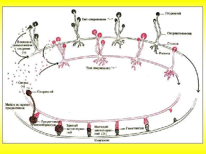 Плесневые грибы. Дрожжи Гифы разных мицелиев сближаются вздутыми концами — гаметангиями, которые отделяются от мицелия перегородками, оболочки между ними растворяются, и происходит слияние цитоплазмы и ядер разных знаков. Образуется зигота с многочисленными диплоидными ядрами, покрывающаяся толстой шиповатой оболочкой. После периода покоя ядра претерпевают мейоз, наружная оболочка зиготы лопается, и она прорастает в короткую гифу, заканчивающуюся небольшим спорангием. В нем в результате мейотического деления образуются "+" и "-" споры. Из этих спор развивается вегетативные "+" и "-" мицелии.