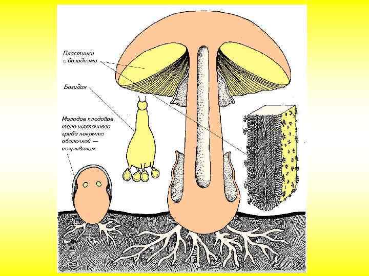 Шляпочные грибы Для большинства базидиомицетов характерно образование плодовых тел. Они могут иметь вид пленки, копытообразных выростов, но чаще всего состоят из шляпки и ножки. Именно их в обыденной жизни называют грибами. Как правило, шляпка покрыта окрашенными гифами, образующими кожицу. Функция плодовых тел — образование спор.